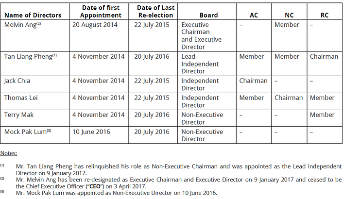 * The CEO, Mr. Melvin Ang has been re-designated as Executive Chairman on 9 January 2017 and ceased as the CEO on 3 April 2017.